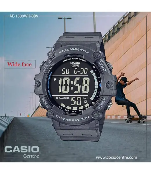 ბრენდი: Casio მოდელი: AE1500WH-8BV კორპუსის დიამეტრი: 5,1 სმ კორპუსის სისქე: 15,73 მმ წყალგაუმტარი: 100 მ