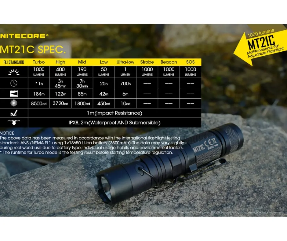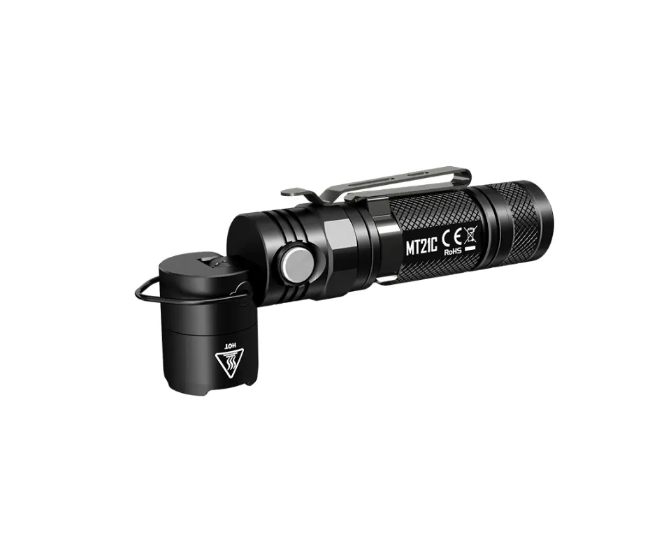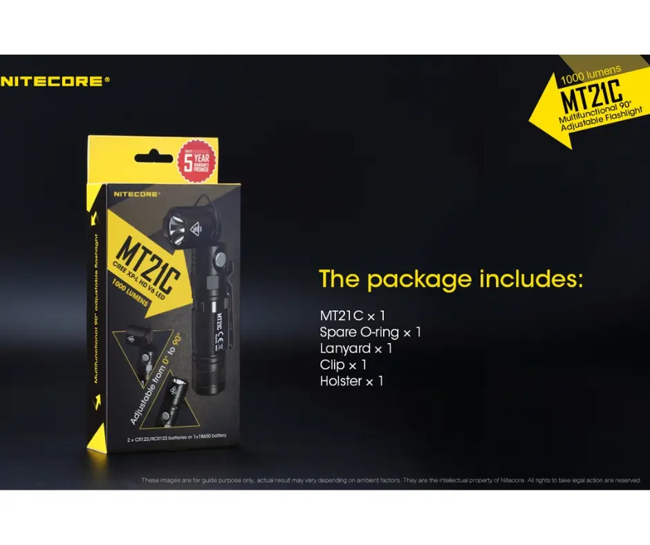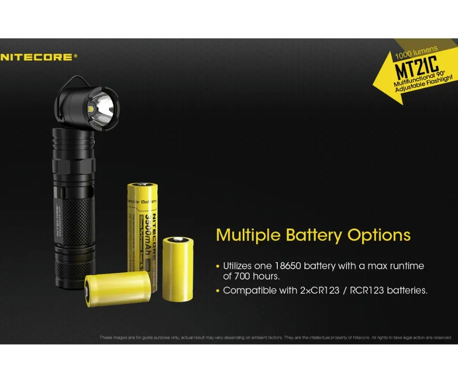 ელემენტი: 1 × 18650, 2 × CR123, 2 × RCR123 (არ მოყვება)