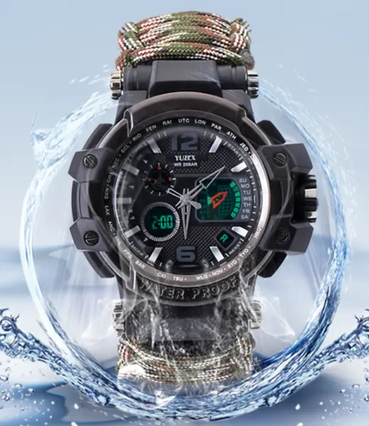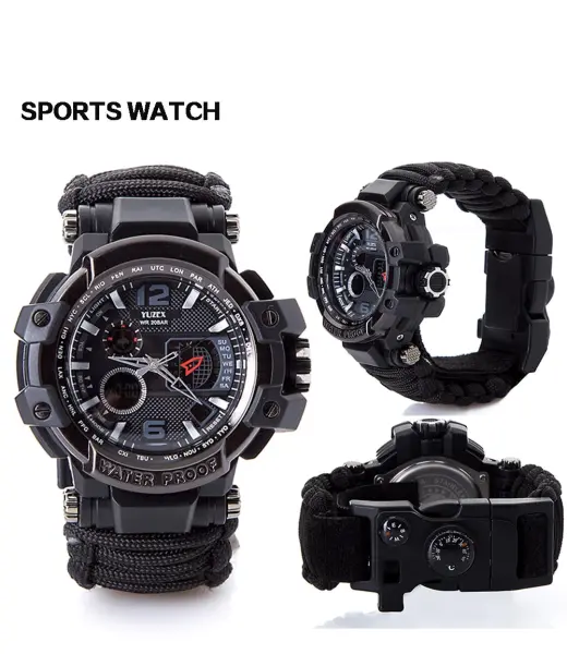 წყალგაუმტარი ტაქტიკური საათი პარაკორდის თოკზე -სამაჯურზე კომპასით, საყვირით და მაგნეზიუმის ასანთით